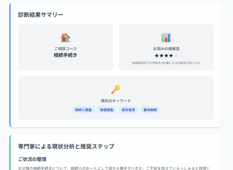 ご記入いただいた内容に基づき、①あなたの手続きの難易度(5段階評価など)、②手続き完了までの全体の流れ(図解など)、③今すぐあなたがやるべき、具体的な最初の一歩、の3点を分かりやすくまとめています。