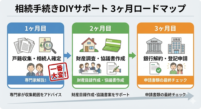 仕事のあいまに相続手続きを進めるお客様を想定しています。書類の準備、役所や金融機関の予約、相続人の間での書類のやり取りなどを考えると、着実に進めてぎりぎり終わるかどうかの期間です。その間、親身になってサポートいたします。